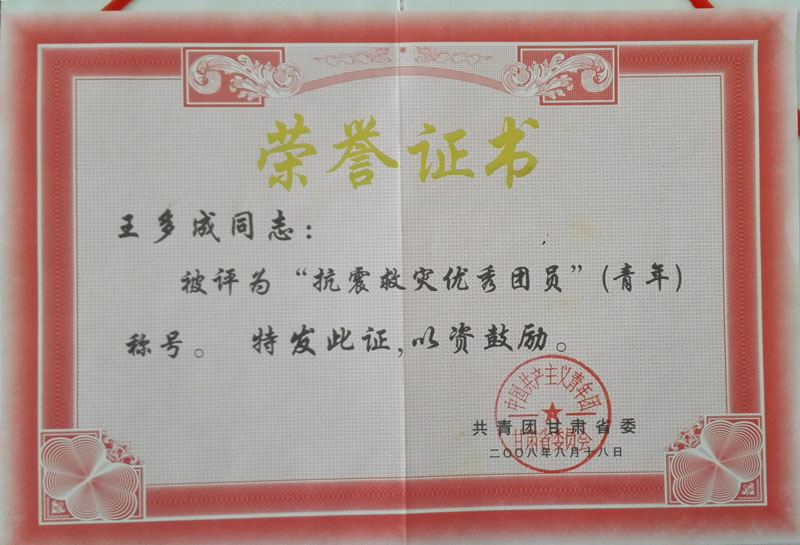 2008年榮獲抗震救災優(yōu)秀青年稱號榮譽證書